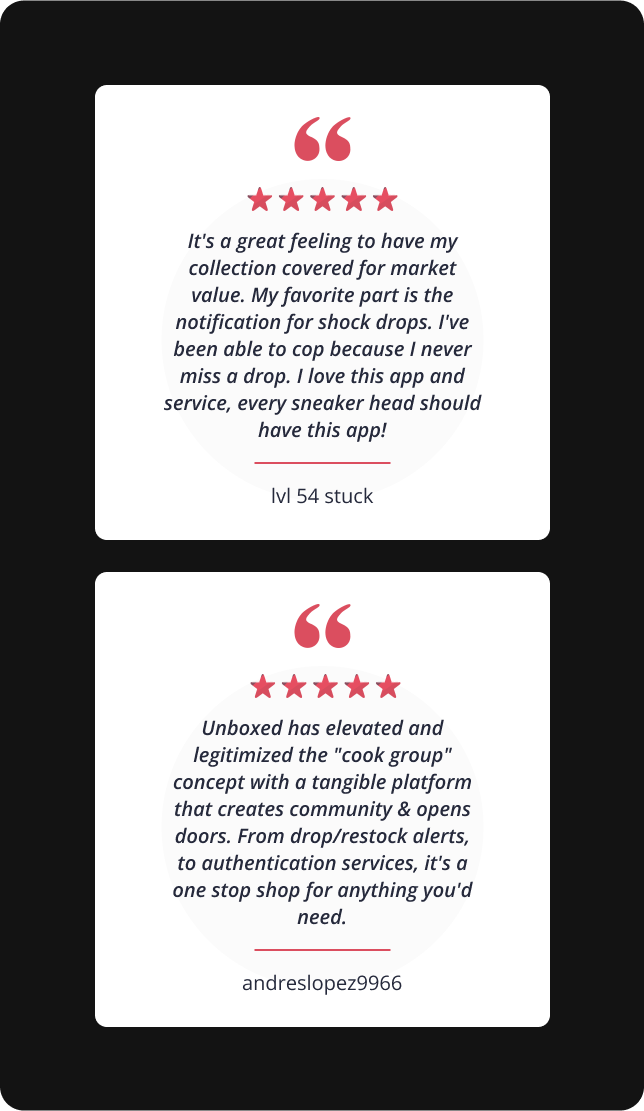 Unboxed World’s best sneaker intel tools, trusted by 10,000+ sneakerheads. Unboxed learns as your collection grows, helping our members discover three times as many kicks. Get real-time market insights and personalized recommendations tailored just for you. Join the community that’s always a step ahead in the sneaker game